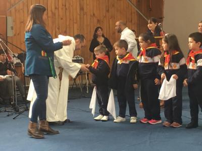 En el momento de las ofrendas , los niños de pre-kinder a 4 básico regalaron a nuestra Madre el rosario redentor hecho por ellos en plumavit, y lo más importante rezado por ellos cada mañana haciéndose cargo por nivel de un denario. Luego los jóvenes de PJM entregaron un canasto con alimentos no perecibles para los hermanos migrantes.